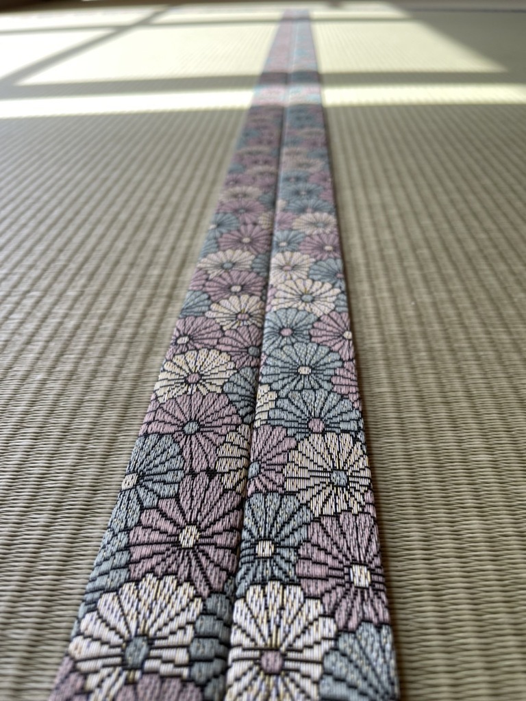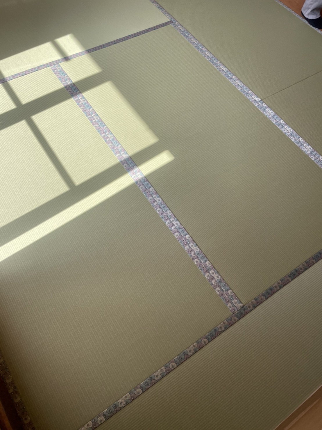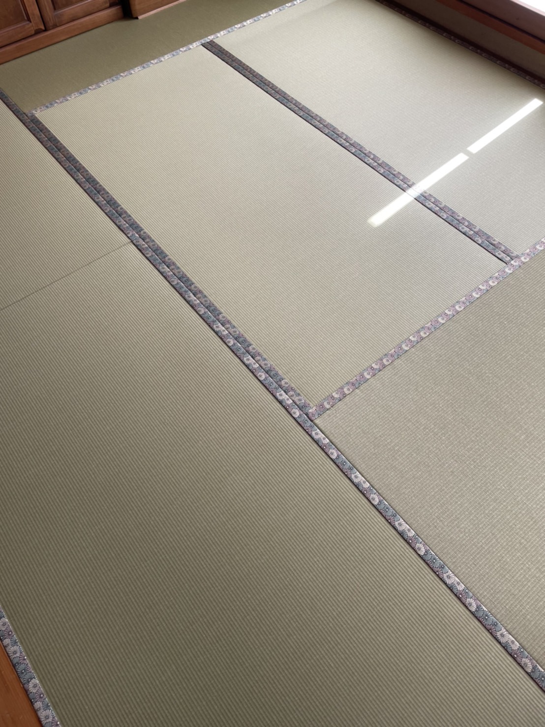 今回はDAIKEN和紙表「清流銀白色」と大宮縁「織部No.7」を使用した新畳になりました。