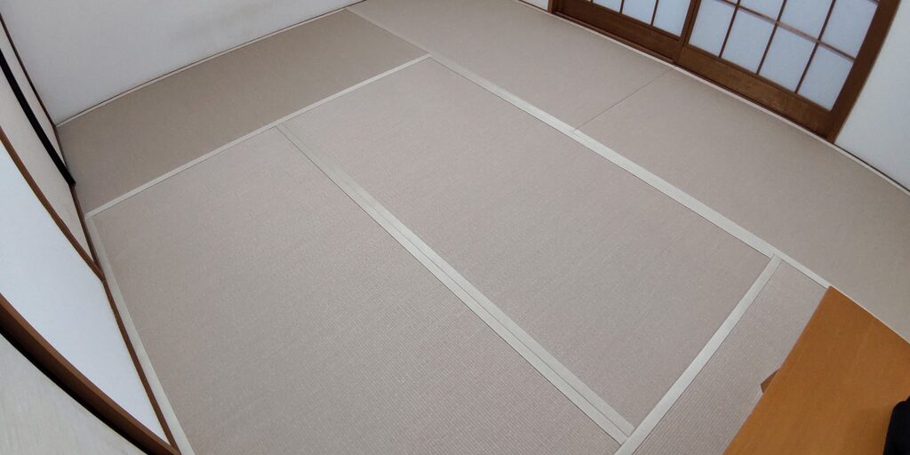 お客様とご相談の結果、DAIKEN和紙表「清流カクテルフィットNo.17」に「ストリームNo.10」の畳縁を使用した表替えとなりました。