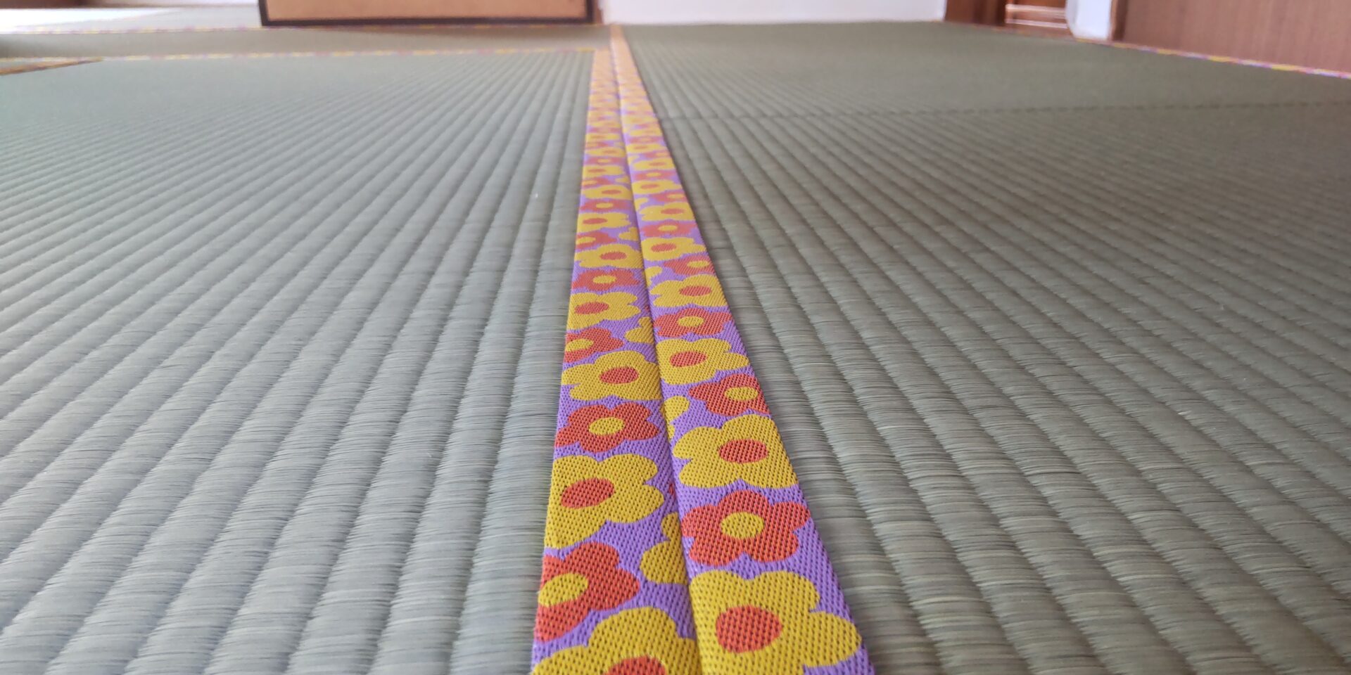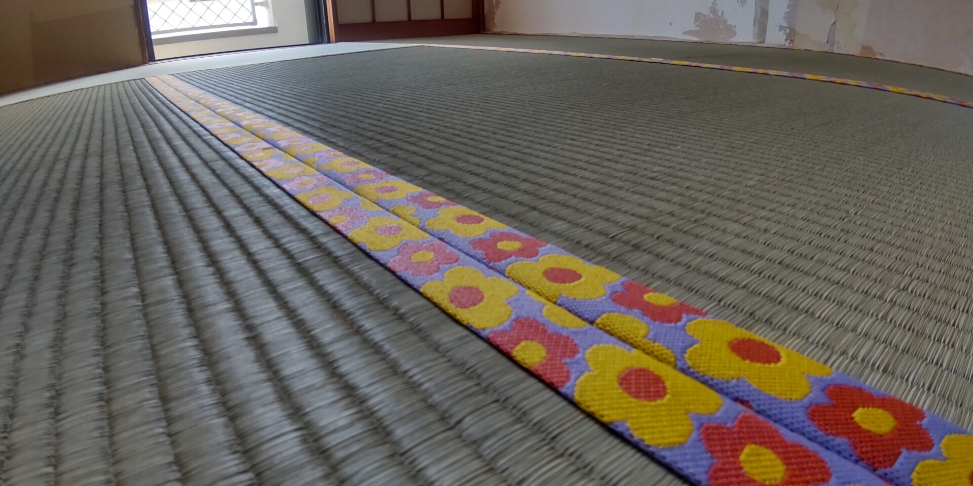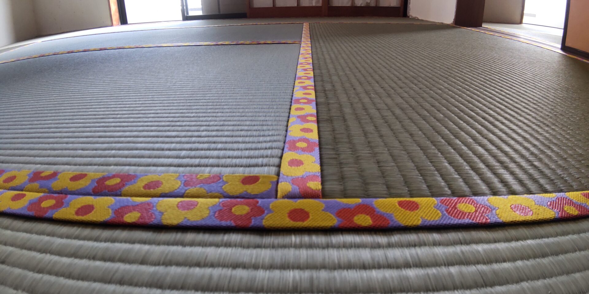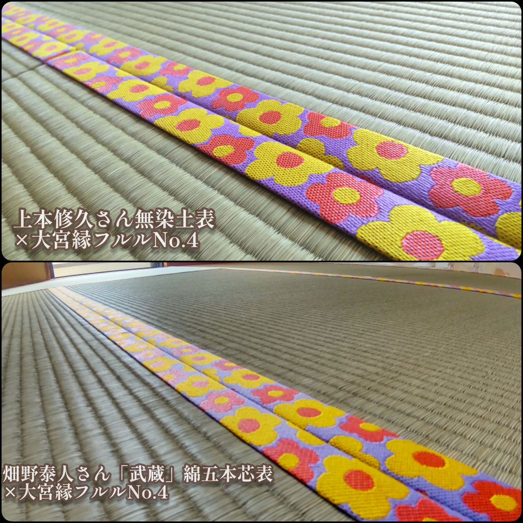 違う農家さんの畳表が、花柄の畳縁を通じて一体感のある空間になりました❇️