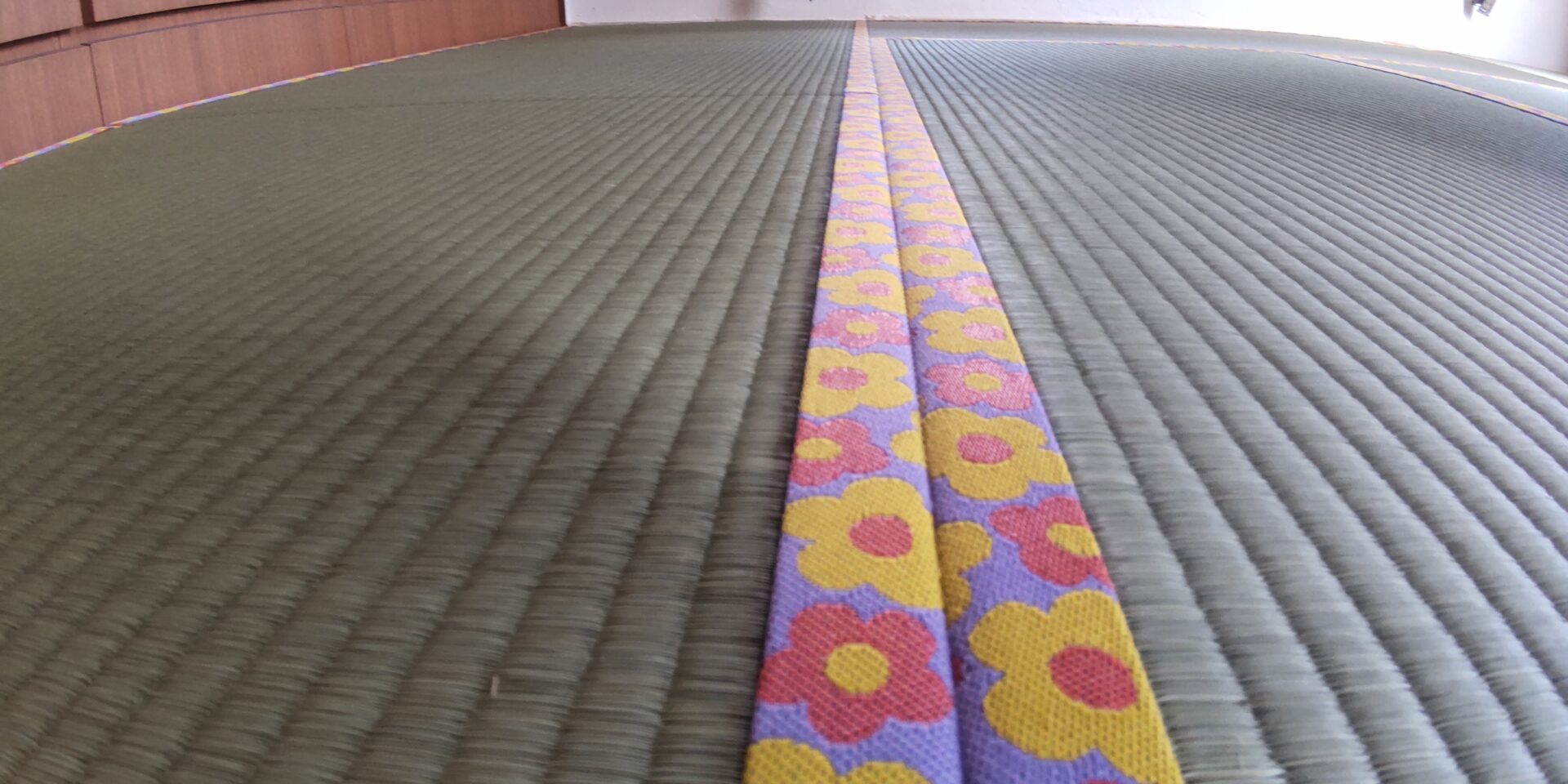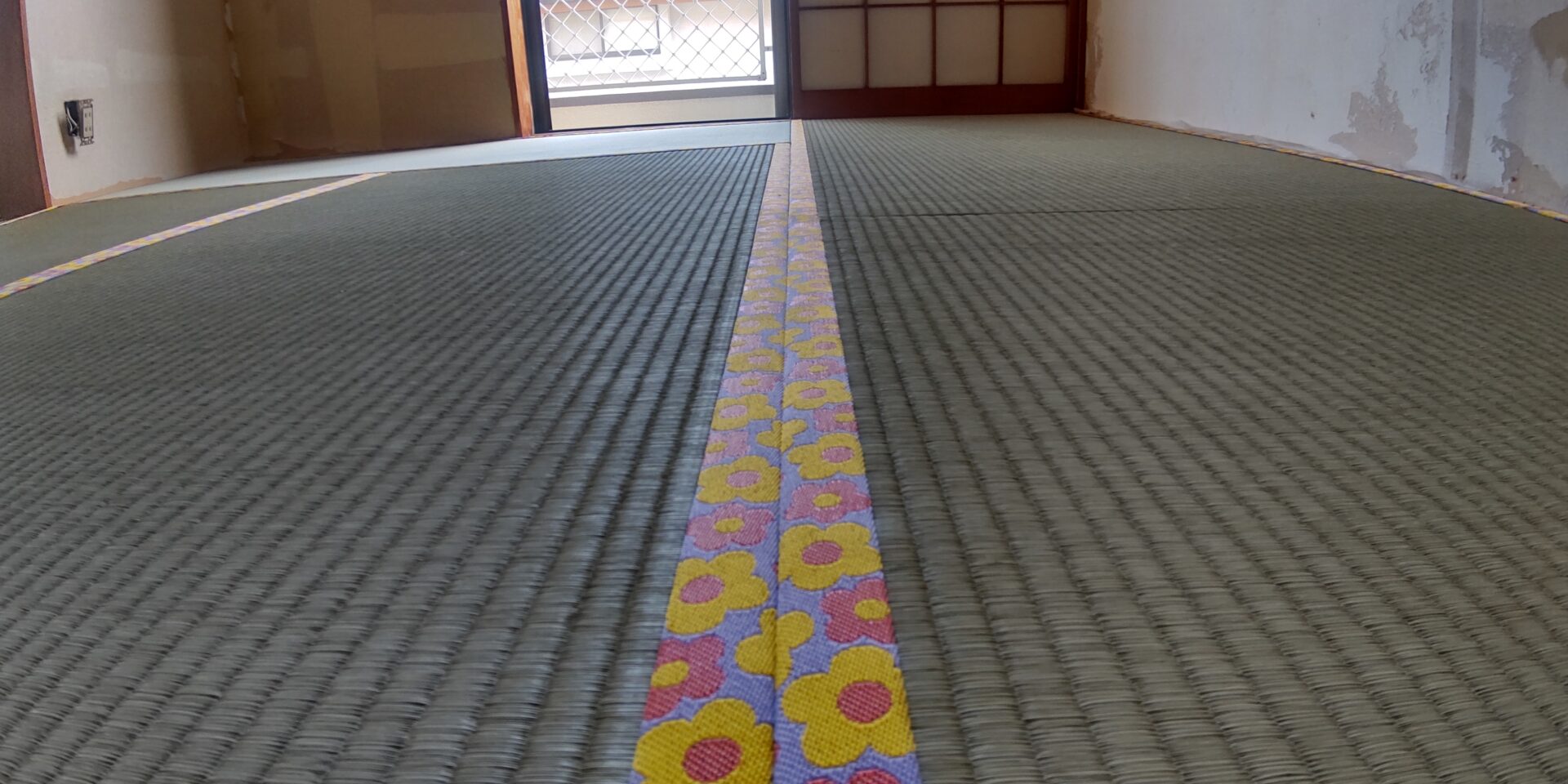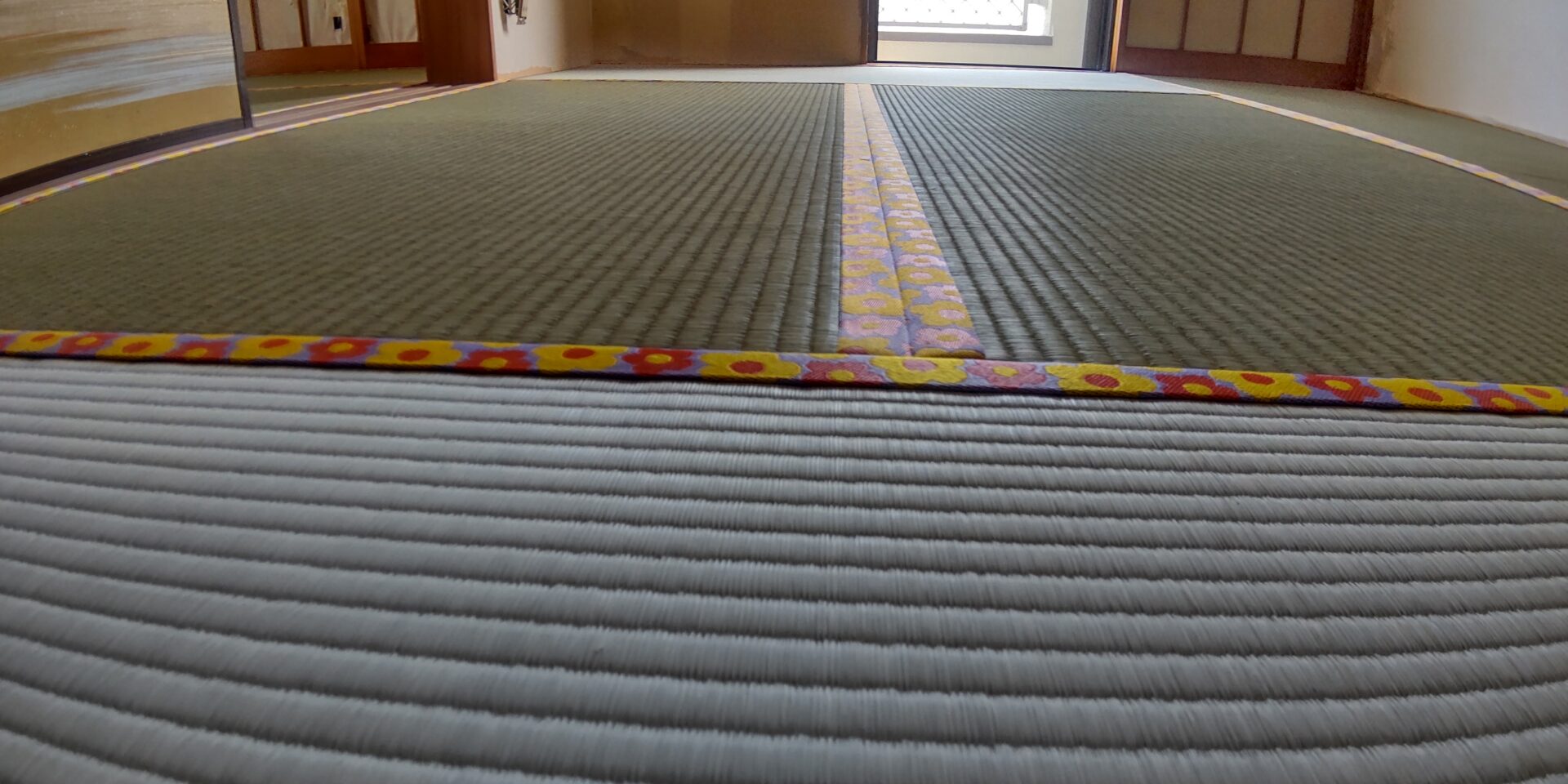 違う農家さんの畳表が、花柄の畳縁を通じて一体感のある空間になりました❇️