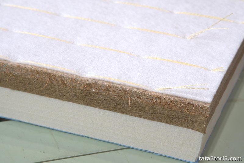 芯(真ん中)をスタイロフォームを使用。上下をインシュレーションボード(木材チップを圧縮したもの)で挟んだ畳床です。マンション等でよく使用されています。